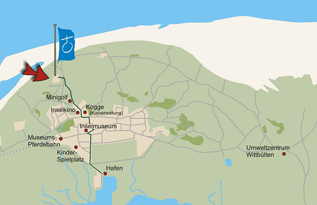 Folgen Sie dabei dem "Wüppspoor" bis zur Apotheke und biegen leicht links ab (immer noch Wüppspoor). Nach 50 m – vor dem Inselmuseum – biegen Sie scharf rechts auf "Westerloog" ein. Nach ca. 30 m befinden Sie sich auf "Noorderloog".